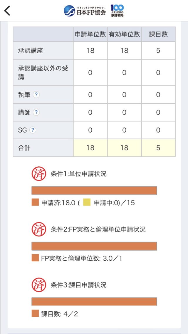 (4)の所定の継続教育期間ってのが登録して2年なので、この2年間の間にFPで必須の6課目のうち3課目(FP倫理は必須)を合計15単位取得すればOKということ。