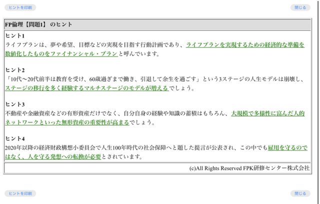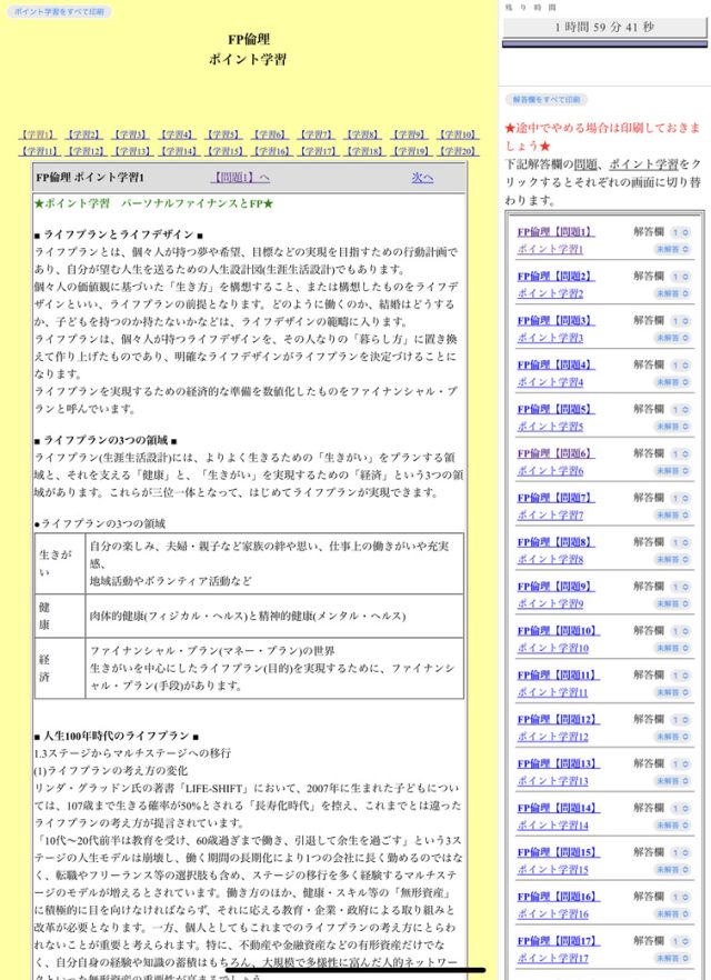 さっそくログインしてみると、こんな感じで左側にコラムが表示されて、学習のポイントとなる内容が読めます。(画像はFP倫理の画面)