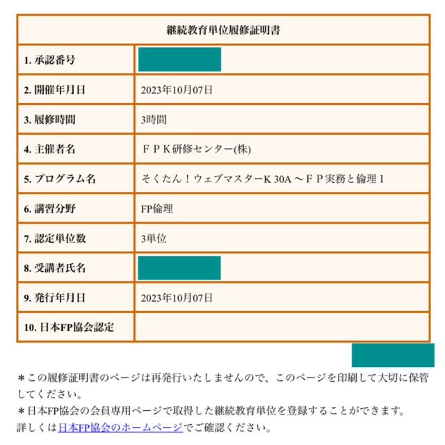 あとは、承認番号をFP協会の単位申請のところに入力するだけでOK!簡単!