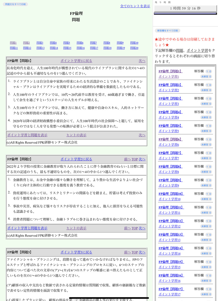 テストは全部で20問の4肢択一、10問以上で合格、出題範囲はFPのすべての課目が網羅されている。